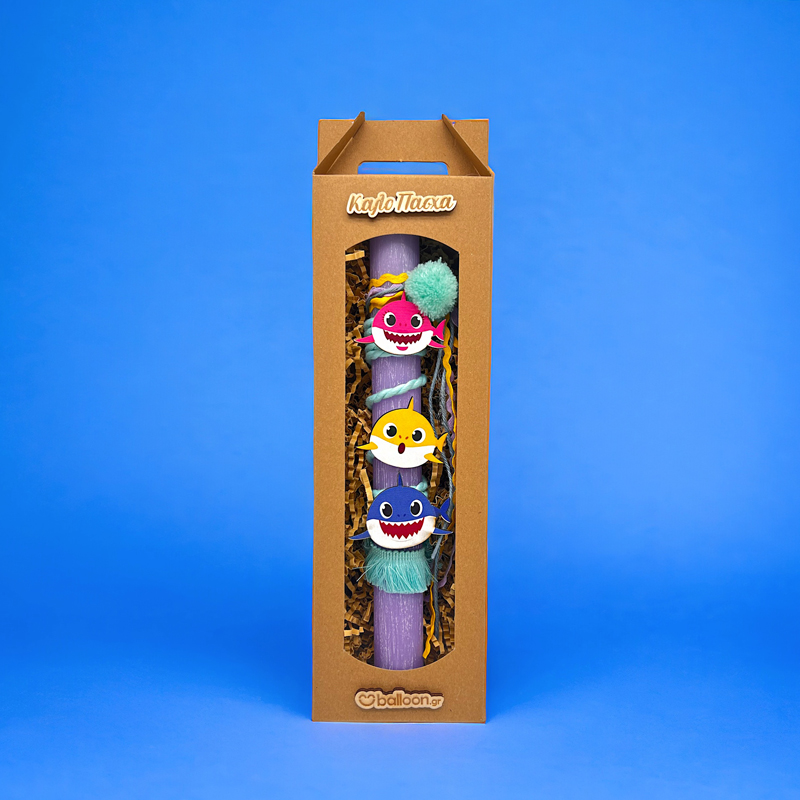 Αρωματική Πασχαλινή Λαμπάδα Baby Shark, με ξύλινες φιγούρες, κορδέλες και υπέροχο άρωμα.