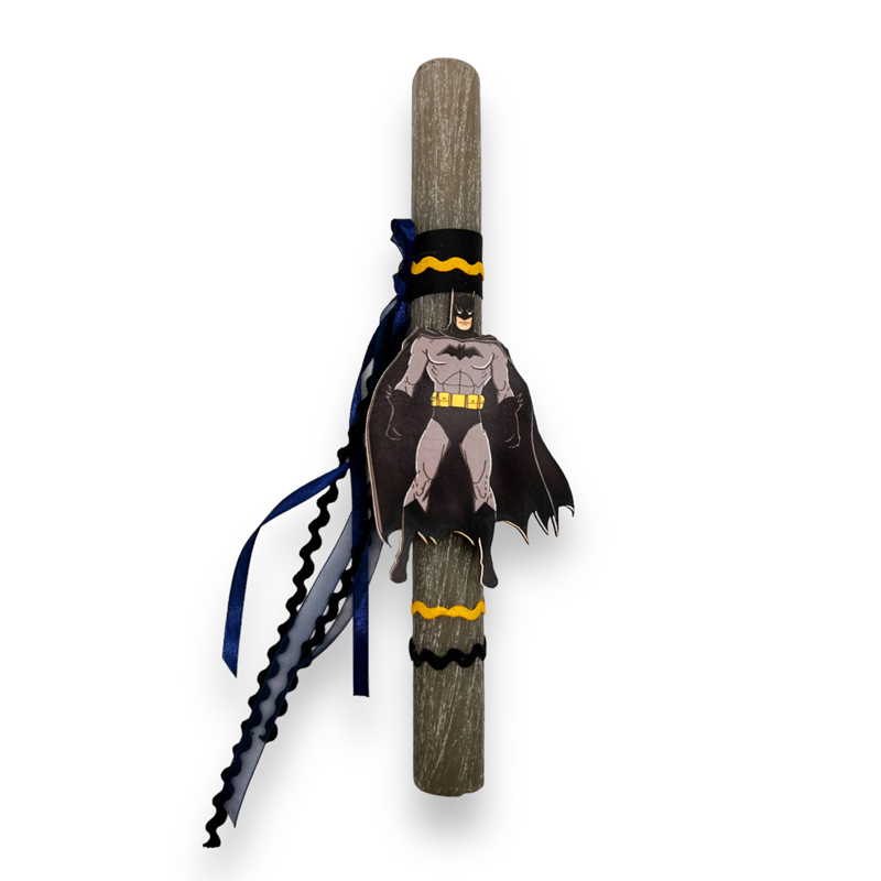 Αρωματική Πασχαλινή Λαμπάδα Batman με ξύλινη φιγούρα και πολύχρωμες κορδέλες.