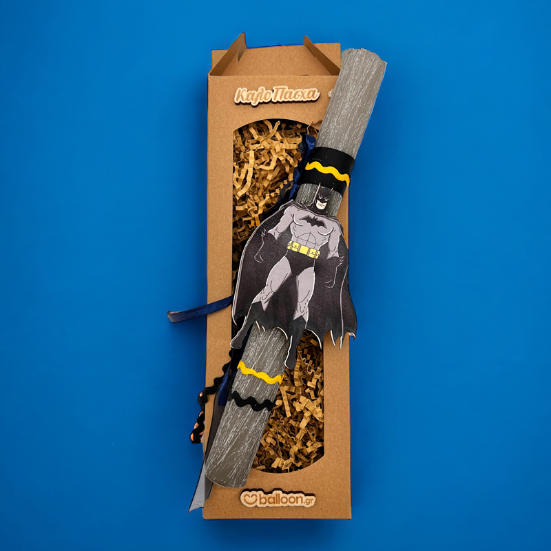 Διακοσμημένη με εντυπωσιακή ξύλινη φιγούρα Batman 13 εκατοστών και πολύχρωμες κορδέλες που ταιριάζουν αρμονικά μεταξύ τους.