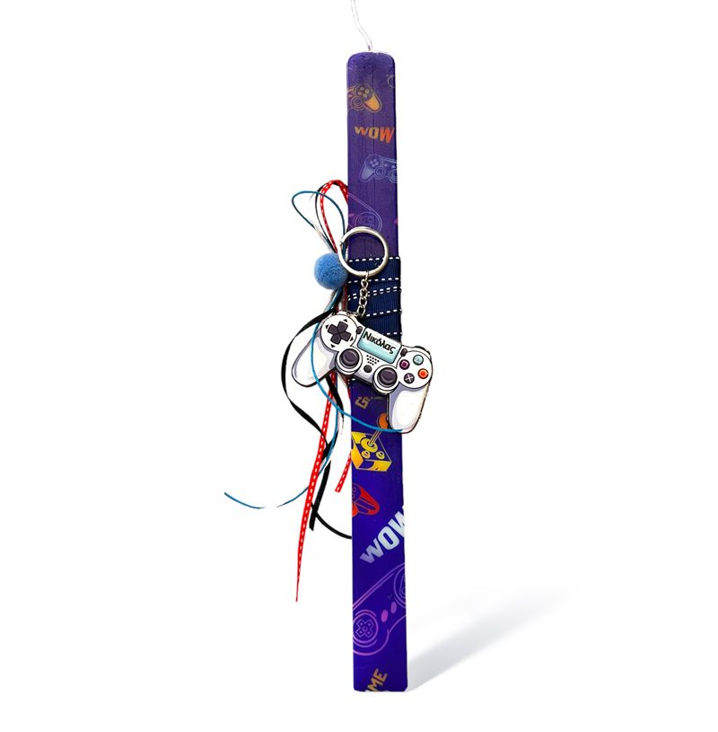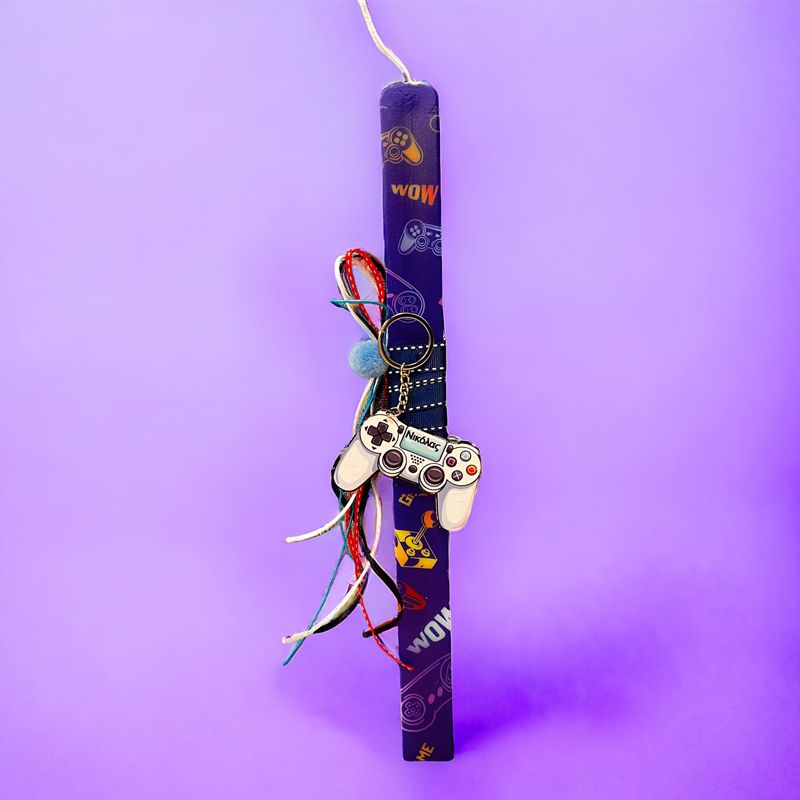 Αυτή η εντυπωσιακή λαμπάδα διαθέτει ένα ξύλινο μπρελόκ με σχέδιο gaming και είναι διακοσμημένη με κορδέλες σε ταιριαστά χρώματα, προσδίδοντας μοναδικό στυλ.