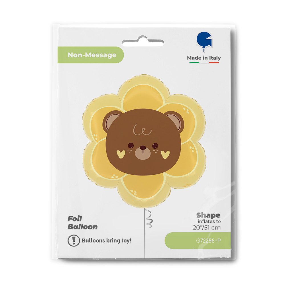 Το μπαλόνι απεικονίζει ένα χαμογελαστό αρκουδάκι μέσα σε ένα λουλούδι, σε παιχνιδιάρικο και πολύχρωμο design που δημιουργεί μια ζεστή, χαρούμενη ατμόσφαιρα. Η τρυφερή φιγούρα του αρκούδου το καθιστά ιδανικό για παιδικά γενέθλια, baby showers, βαφτίσεις ή θεματικά πάρτι με cute χαρακτήρα.