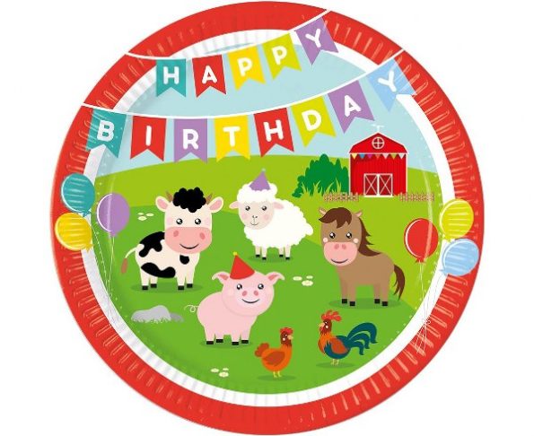 Τα πιάτα διαθέτουν χαρούμενα σχέδια ζώων της φάρμας ζωγραφισμένα με ζωντανά χρώματα που φέρνουν παιδική αισθητική και θεματική διάθεση. Είναι κατασκευασμένα από ανθεκτικό, ασφαλές για τρόφιμα χαρτί, ώστε να αντέχουν το βάρος του γλυκού ή του φαγητού και να μην σκίζονται εύκολα.