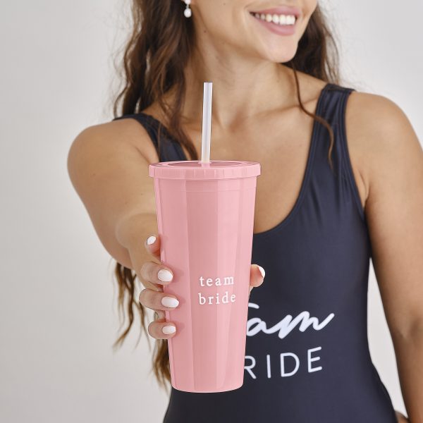 Ροζ επαναχρησιμοποιούμενο ποτήρι με καλαμάκι και επιγραφή “Team Bride” – ιδανικό για bachelorette, bridal shower και καλοκαιρινά πάρτι.