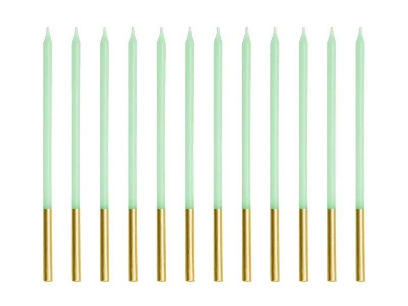 Ανανεώστε τη διακόσμηση της τούρτας σας με αυτά τα ψηλά κεράκια σε απαλή απόχρωση μέντας (mint green) με εντυπωσιακή χρυσή βάση. Ο συνδυασμός του pastel πράσινου με τη λάμψη του χρυσού δημιουργεί μια εκλεπτυσμένη, ανοιξιάτικη αισθητική που ταιριάζει σε γενέθλια, baby shower, βάπτιση ή κάθε celebration με κομψό χαρακτήρα.