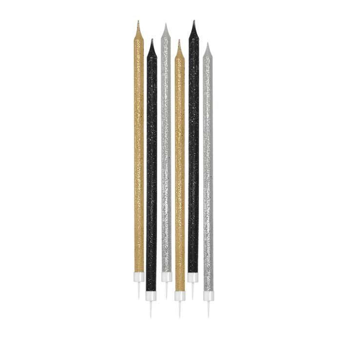 Κεριά Ασημί, Χρυσό και Μαύρο Prestige Glitter – 6 τμχ.