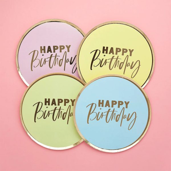 Σε υπέροχα παστέλ χρώματα με χρυσό περίγραμμα και το μήνυμα “Happy Birthday”, αυτά τα πιάτα είναι ιδανικά για κάθε εορταστικό τραπέζι.