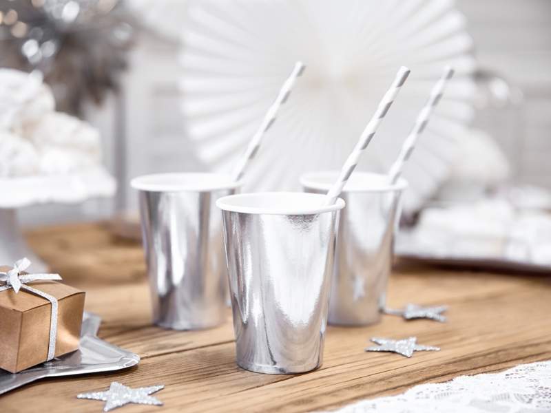Κατασκευασμένα από ανθεκτικό χαρτί μιας χρήσης, αυτά τα ποτήρια είναι ιδανικά για σερβίρισμα κρύων ροφημάτων κατά τη διάρκεια του πάρτι, παρέχοντας πρακτικότητα και αισθητική σε ένα. Το ασημί μεταλλικό χρώμα τους τα καθιστά πολύ εύκολα στο να ταιριάξουν με άλλες διακοσμητικές επιλογές, όπως πιάτα, χαρτοπετσέτες ή τραπεζομάντηλα στο ίδιο ύφος.