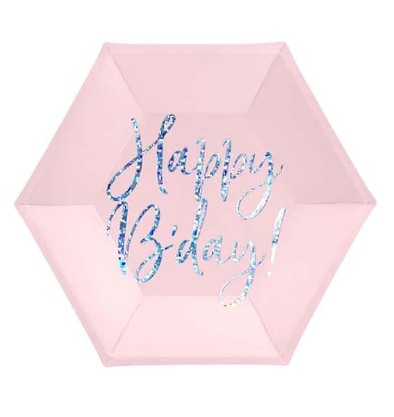 Χάρτινα πιάτα γλυκού πάρτι σε απαλό ροζ χρώμα, με την ένδειξη “Happy B’day!” σε ιριδίζουσα γραφή.