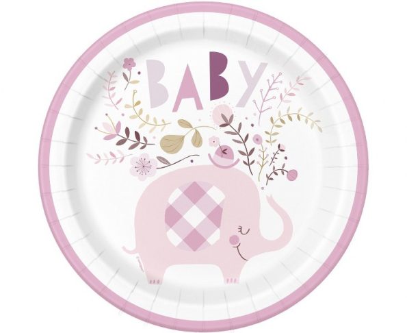 Χάρτινα πιάτα φαγητού με θέμα ροζ ελεφαντάκι, ιδανικά για baby shower, βάπτιση ή τα πρώτα γενέθλια.