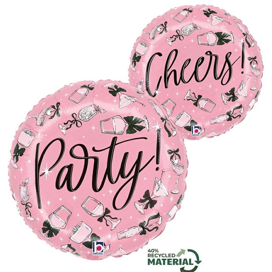 Το ροζ στρογγυλό μπαλόνι με μήνυμα “Party” από τη μία πλευρά και “Cheers” από την άλλη είναι η ιδανική επιλογή για να δώσετε κομψό και γιορτινό ύφος στη διακόσμηση του πάρτι σας. Διακοσμημένο με μαύρα φιογκάκια και ποτήρια σαμπάνιας, συνδυάζει θηλυκό στυλ και festive διάθεση, κάνοντάς το τέλειο για γενέθλια, bachelor/bachelorette, γυναικεία πάρτι, επετείους ή βραδιές celebration.