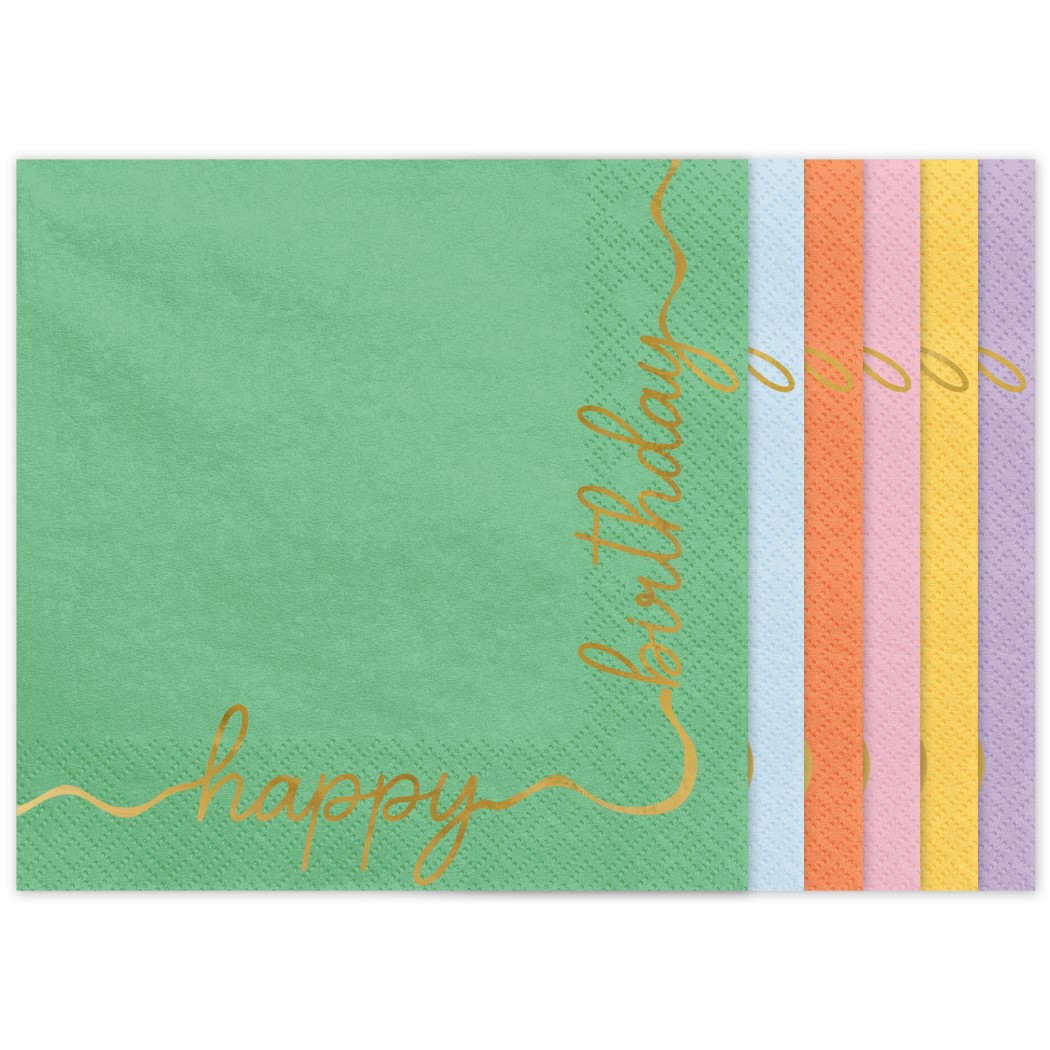 Χαρτοπετσέτες σε παστέλ αποχρώσεις με elegant design Happy Birthday, ιδανικές για κομψά πάρτι.