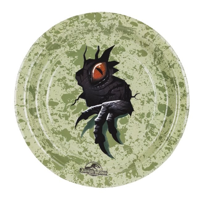 Χάρτινα πιάτα γλυκού Jurassic World με σχέδιο δεινοσαύρων, ιδανικά για παιδικά πάρτι και θεματική διακόσμηση.