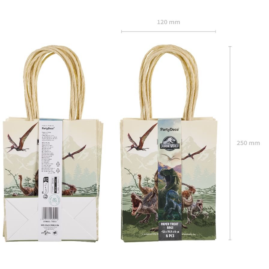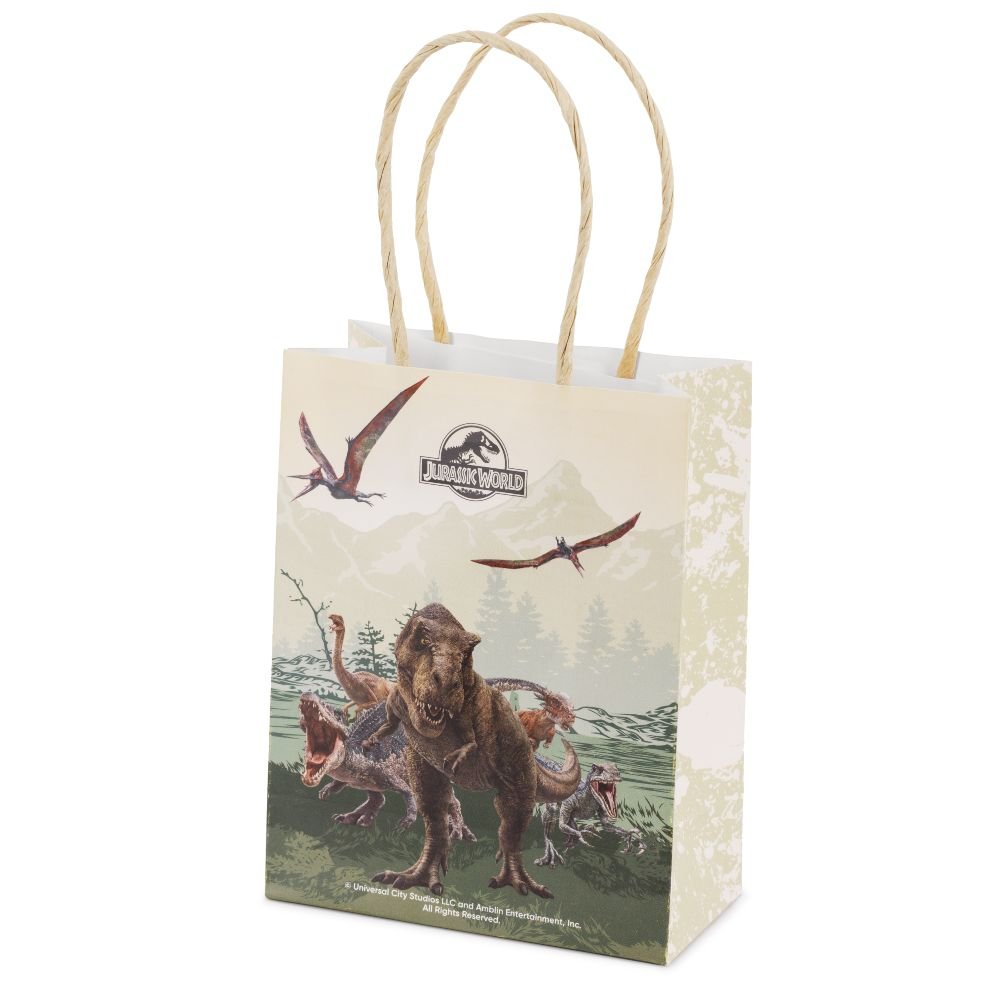 Σετ χάρτινα σακουλάκια Jurassic World με δεινοσαύρους και λαβή, ιδανικά για παιδικά πάρτι.