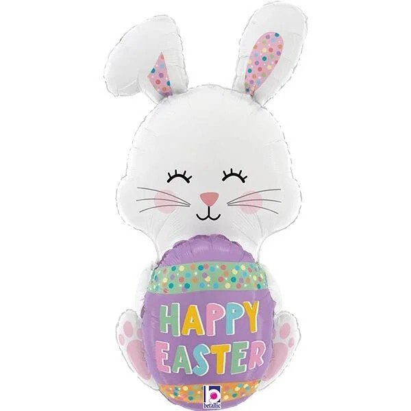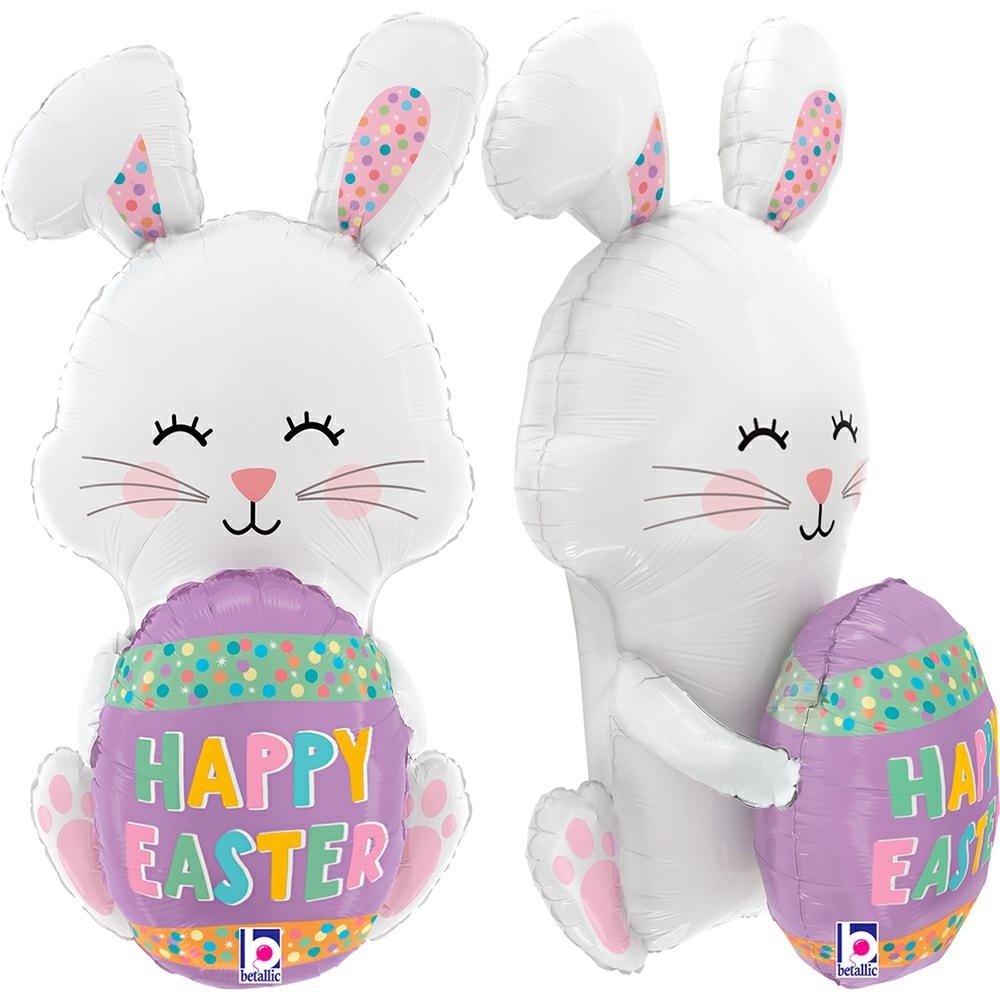 Μπαλόνι foil 3D λαγουδάκι που κρατά πασχαλινό αυγό με ευχή “Happy Easter”, ιδανικό για πασχαλινή, ανοιξιάτικη διακόσμηση & party décor.