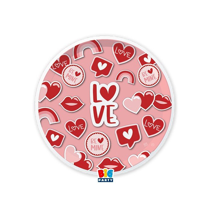 Τα πιάτα φέρουν εντυπωσιακό ρομαντικό σχέδιο με καρδιές και love stickers, προσθέτοντας μια τρυφερή και παιχνιδιάρικη αίσθηση στο τραπέζι. Η απεικόνιση των καρδιών αναδεικνύει το θέμα της αγάπης και δημιουργεί μια ζεστή, ρομαντική ατμόσφαιρα, ιδανική για ξεχωριστές στιγμές και εορτασμούς.