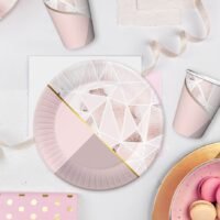 Χάρτινα πιάτα γλυκού Rose Marble σε απαλές ροζ αποχρώσεις με γεωμετρικά σχέδια, marble υφή και χρυσή διαγώνια λεπτομέρεια.